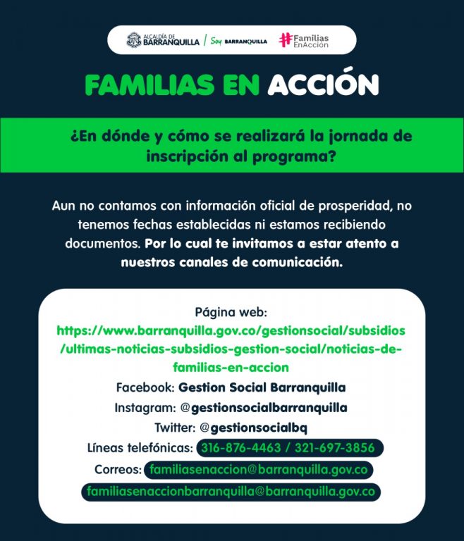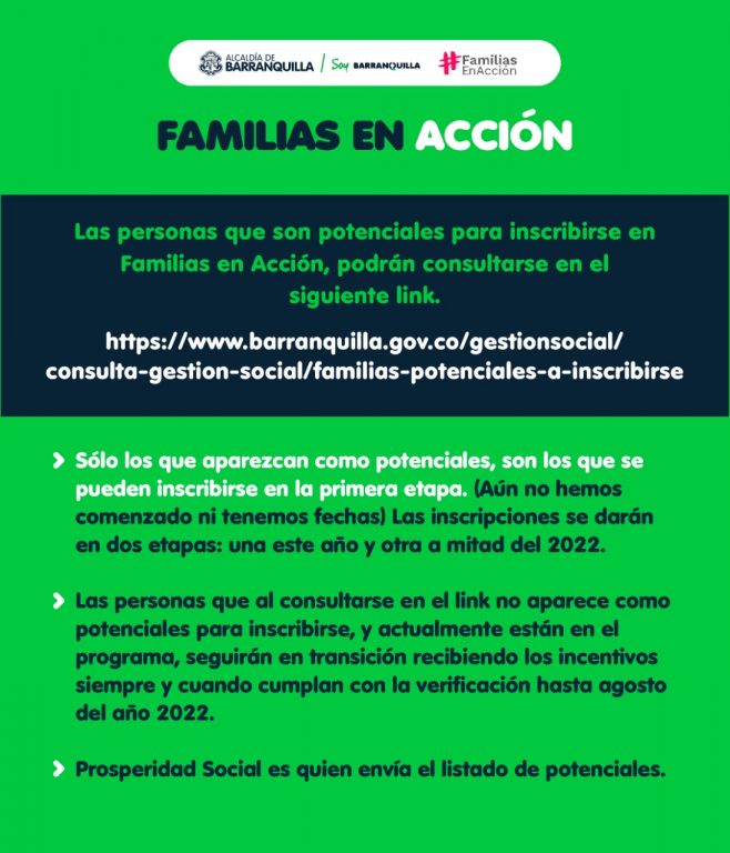 Secciones Inicio Judicial Política Sociales. La Alcaldía de Barranquilla y Prosperidad Social recordaron que las familias que no sean convocadas en esta primera etapa podrán presentarse nuevamente a la segunda que se llevará a cabo durante el segundo semestre del 2022. Así fue la jornada de inscripciones de FamiliasEnAccion en Barranquilla.
